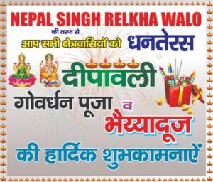 *आप सभी क्षेत्र वासियों को मा० नैपाल सिंह कसाना रीलखा वालों की तरफ से धनतेरस, दीपावली, गोवर्धन पूजा व भैय्यादूज की हार्दिक शुभकामनाएं*
